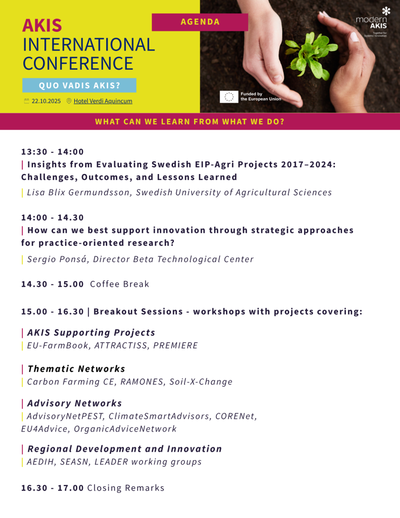 - Afternoon sessions: “What can we learn from what we already do?” – highlighting insights from EIP-AGRI projects and strategies to support innovation through practice-oriented research.