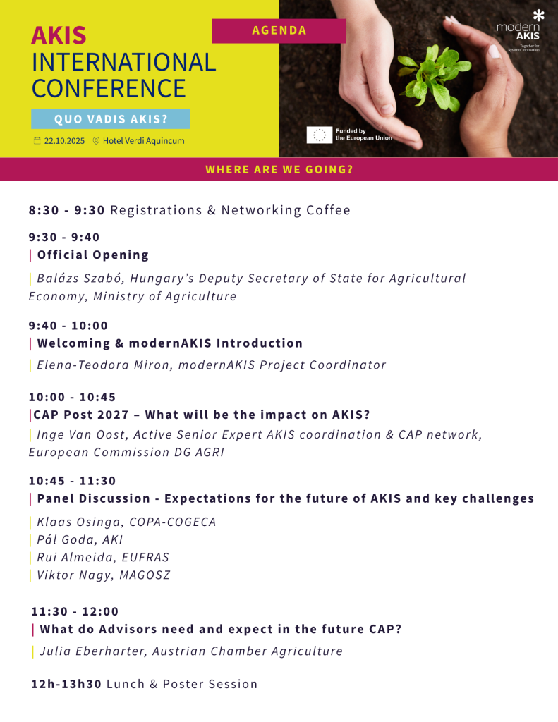The modernAKIS project is pleased to announce the first AKIS International Conference, taking place in Budapest, Hungary on 22 October 2025. We invite you to join this event, which will offer a dynamic platform for reflection, discussion, and knowledge exchange on how Agricultural Knowledge and Innovation Systems (AKIS) can adapt and thrive within the framework of the CAP post-2027.