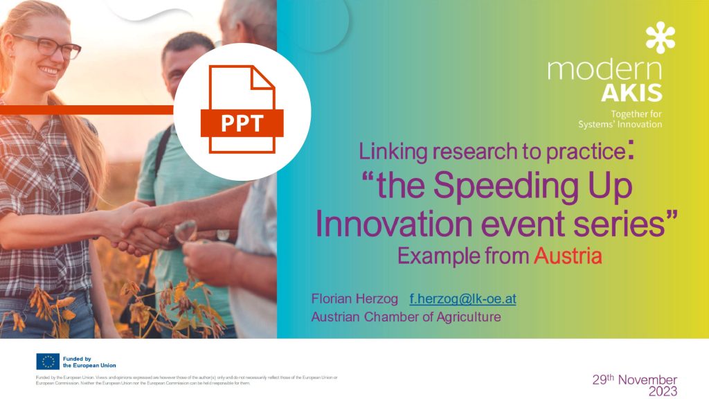 Florian Herzog from the Austrian Chamber of Agriculture exemplified the power of commitment and ownership in driving forward a high-impact series of events to “Speed Up Innovation”, fostering exchange between knowledge multipliers. See his presentation here!