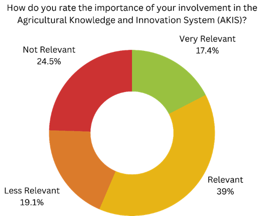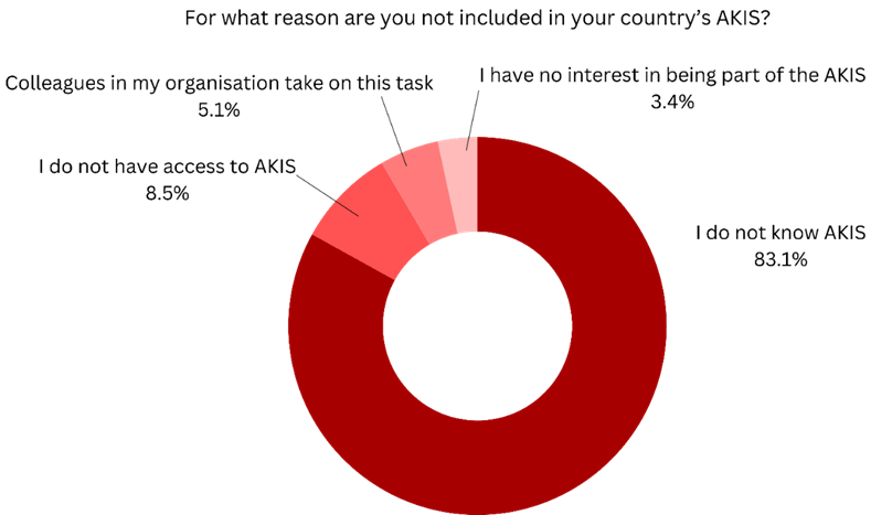 Overall, more than half the respondents (56.4%) rated their involvement in the AKIS as relevant to very relevant. Roughly a quarter of respondents believed that involvement in the AKIS was not relevant to them at all. Those that gave a response of “Not Relevant” were asked a follow up question on why they are not included or involved in their country’s AKIS. Of this proportion of respondents the majority (83.1%) said it was because they did not know AKIS (Figure above), 8.5% indicated it was because they do not have access to AKIS and approximately 5% said it was the role of their colleagues.