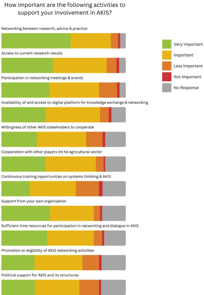 Examining the figure below, the activities that were rated the most important towards supporting advisors’ involvement in the AKIS were i) networking between research, advice and practice, ii) support from their own organisations and iii) access to current research results. Of all activities, continuous training opportunities on systems thinking and AKIS had the most responses rated at less important or not important. The proportion of respondents that gave no response also increased down the list of activities which may indicate stakeholder fatigue or a lack of knowledge about those specific activities.