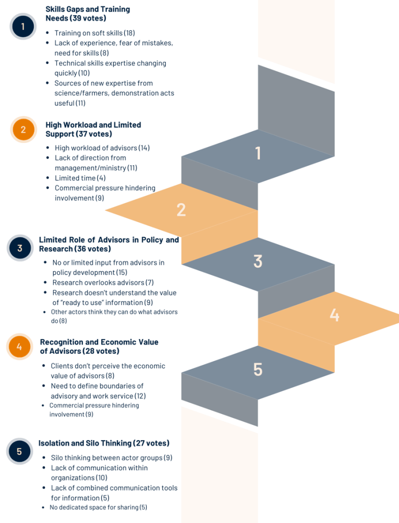 The workshop concluded with each topic facilitator sharing the top barriers identified by their group—offering valuable insights into the main challenges advisors face in connecting with Agricultural Knowledge and Innovation Systems (AKIS) across different countries.